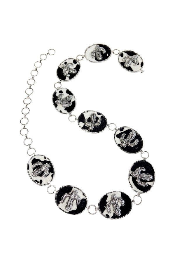 Western Metal Cactus Cow Patch Oval Concho Chain Belt End to end length: 45 InchesWeight: 500 Grams (17.5 OZ)Burnish silver color alloy casting with faux cowhide print10 Metal Conchos (Each Concho Measurement: 3 x 2 Inches)