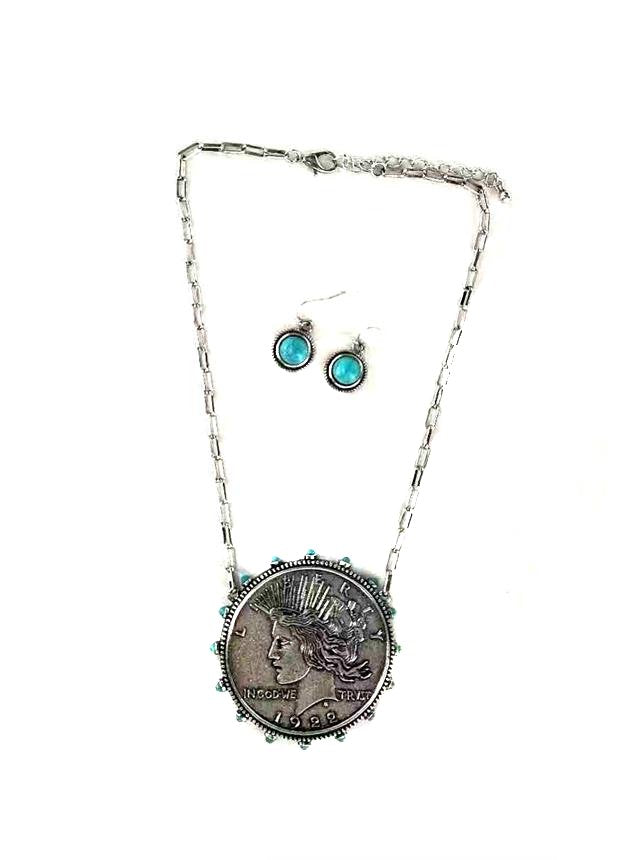 Western Liberty Coin Turquoise Necklace Set with Turquoise Stone Earrings