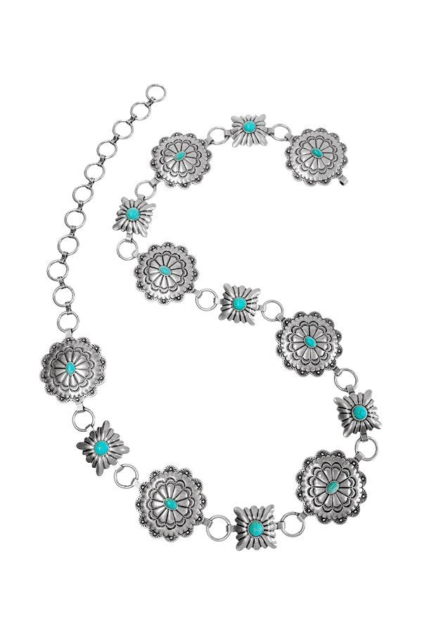 Western Metal Concho with Turquoise Accent Chain BeltEnd to end length: 44 Inches (36 + 8 Inch Extension)Weight: 250 Grams Burnish silver color alloy casting7 Metal Conchos (Each Concho Measurement: 2.5 x 2.5 Inches) + 6 Small Metal Conchos